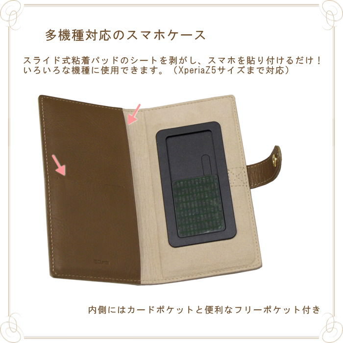 スライド式の粘着パッドが付いた多機種対応のスマートフォンケース です。