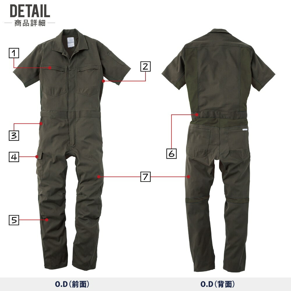 脇メッシュが快適さをUPショルダーに肩章とカラーアクセント夏用半袖ツナギ グリーン
